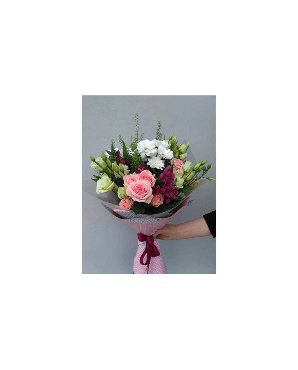 Bukiet kwiatów mieszanych róże, eustoma, margarytka, astromeria.