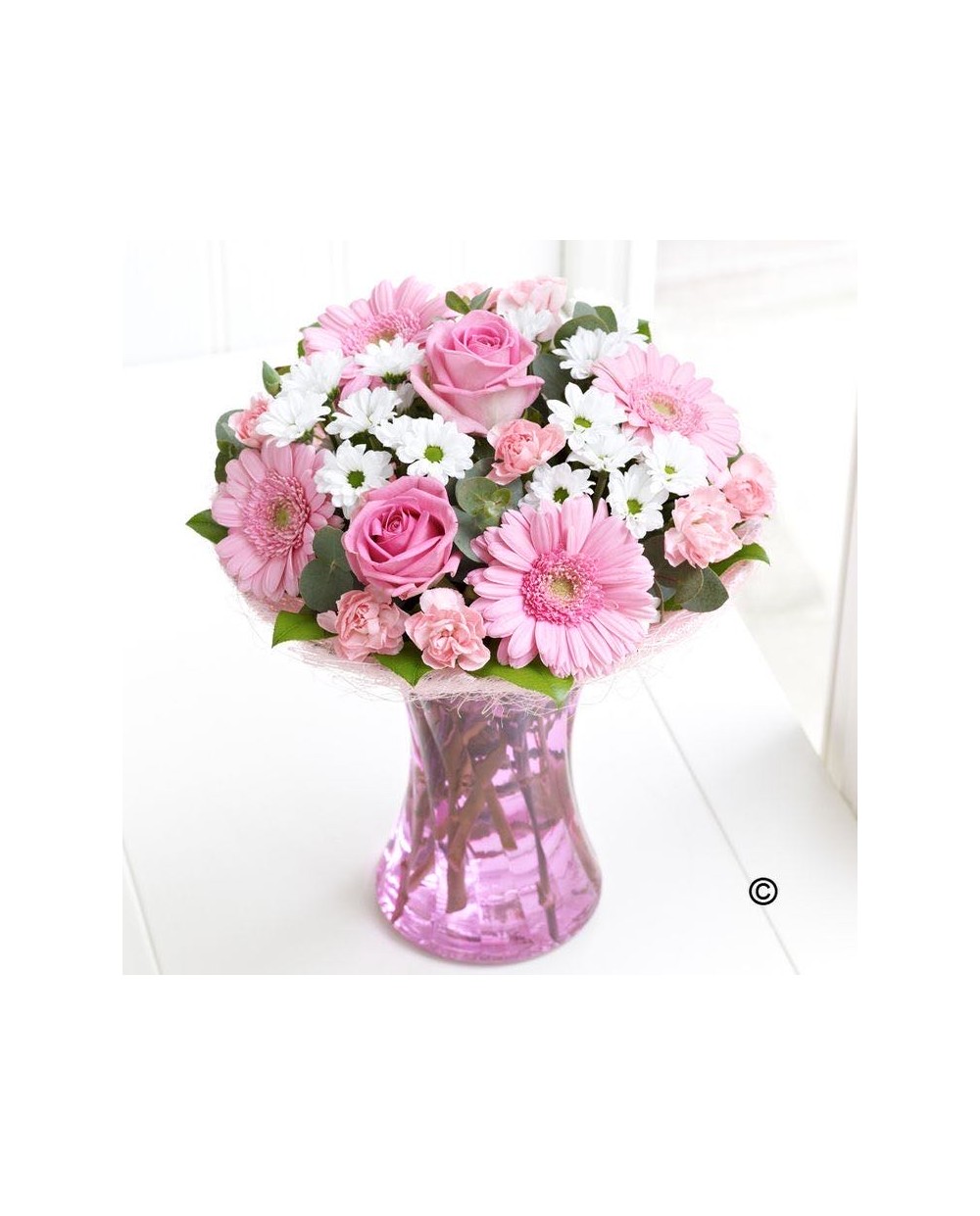 Piękny bukiet mieszanych kwiatów w odcieniach różu z dodatkiem białych margarytek. Połączenie kwiatów oraz kolorów stanowi wspaniały powiew świeżości oraz wzbudzi uśmiech na twarzy każdego odbiorcy.