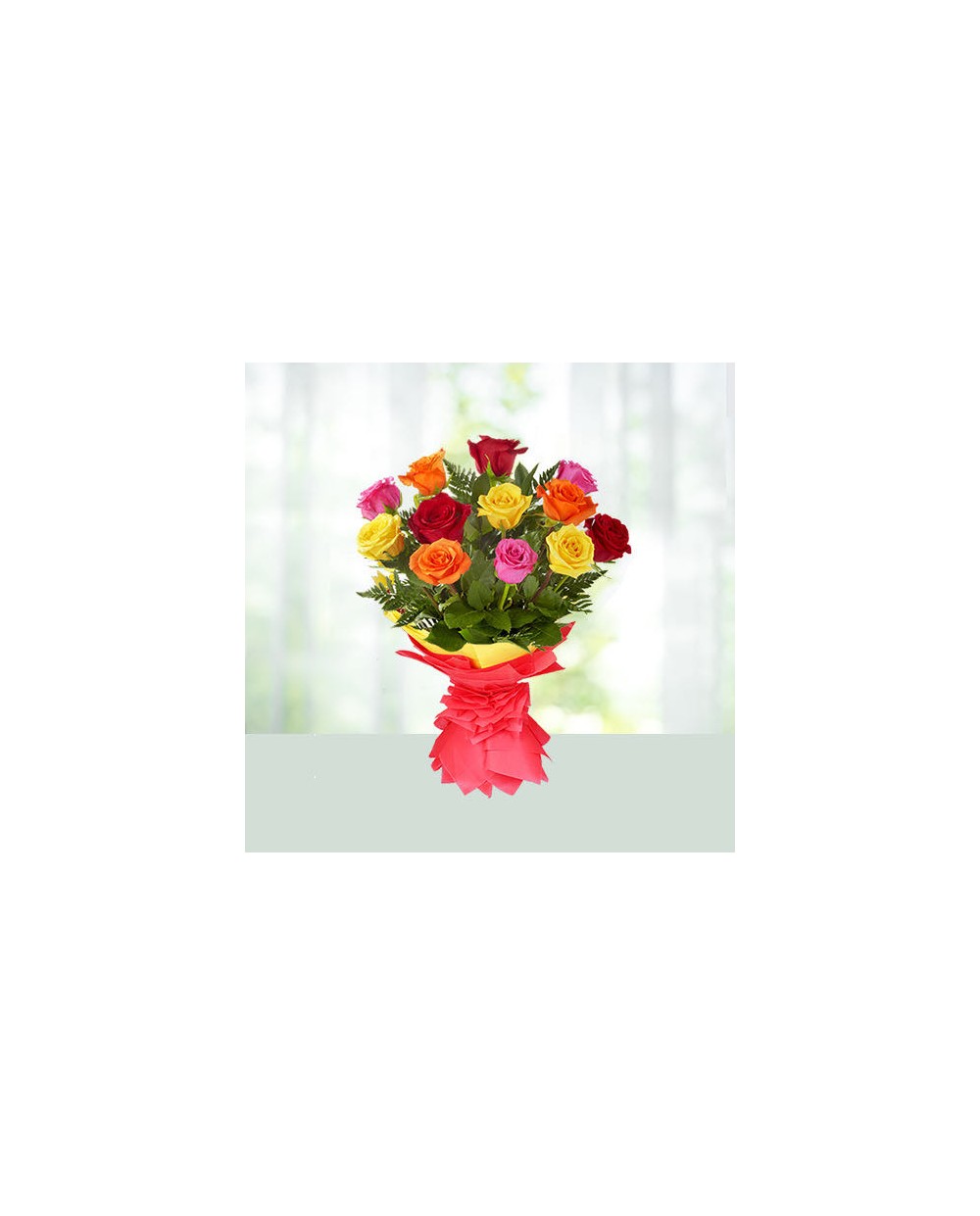 Piękny bukiet kolorowych róż rozświetlających każde pomieszczenie. Kompozycja wniesie dużo uśmiechu, szczęścia oraz ciepła w życie każdego odbiorcy.
